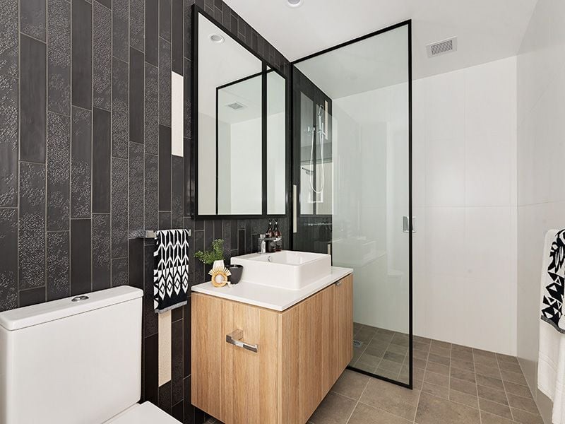 - Modern fully tiled bathroom with modern fixtures
